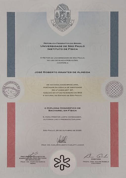 José Roberto Arantes de Almeida nasceu em Pirajuí, no ano de 1943. No último dia 3 de novembro de 2025, ele recebeu o diploma honorífico pelo Instituto de Física da Universidade de São Paulo (USP), por ser estudante da instituição no período da sua morte.